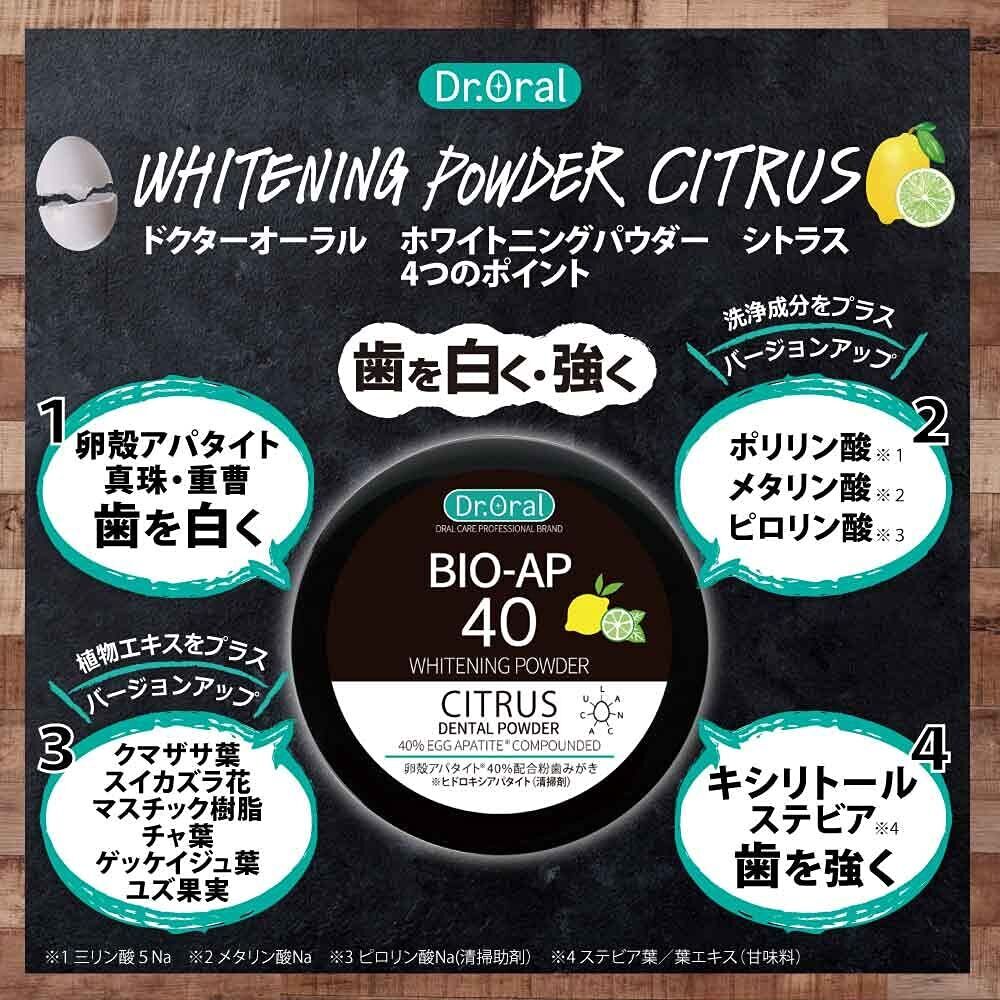 Bột tẩy trắng răng Dr.Oral Whitening Powder Bio-AP 40 (26g) - Nhật Bản là dòng tẩy trắng răng rất nổi tiếng và được nhiều người ưa chuộng tại Nhật Bản. Sản phẩm này mang đến công dụng làm trắng răng 3 trong 1 hiệu quả.